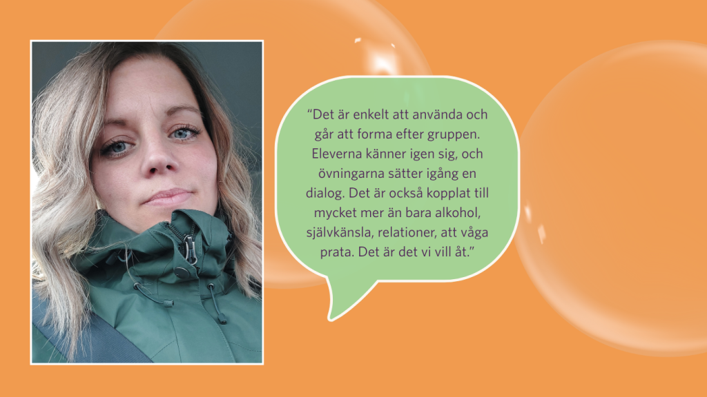 “Det är enkelt att använda och går att forma efter gruppen. Eleverna känner igen sig, och övningarna sätter igång en dialog. Det är också kopplat till mycket mer än bara alkohol, självkänsla, relationer, att våga prata. Det är det vi vill åt.”
