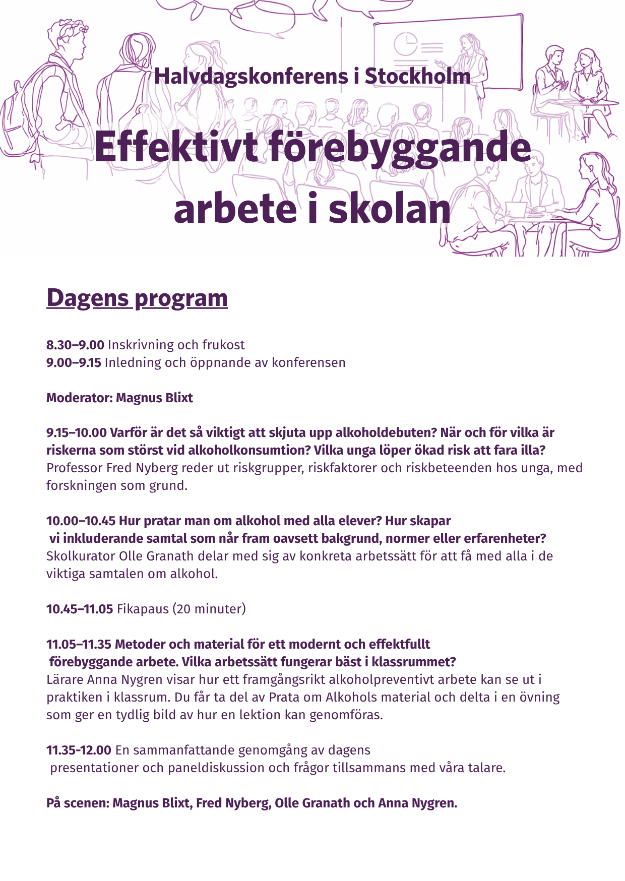 Nu bjuds du in till en inspirerande och kunskapsstärkande förmiddag där vi samlar forskning, erfarenhet och konkreta verktyg för ett effektivt alkoholförebyggande och hälsofrämjande arbete i skolan. Under konferensen får du både förståelse för varför arbetet är så viktigt, hur samtalen kan föras och vilka metoder och material som faktiskt gör skillnad i klassrummet.